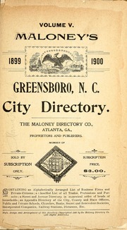 This is the Greensboro city directory from 1899, published by the Hill Directory Co. "(We) did not stop at the city limits proper or any imaginary line, but have embraced all the territory, viz. : Pomona, Proximity, Jonesboro, Jacksonville, Warnersville, etc., and all other territory tributary to the city."-[p.8]. The publication includes an overview of Hot Springs, Arkansas, a section on the government, a reverse street look up, a racially-segregated population directory, a business directory, and an advertisement for the North Carolina State Normal and Industrial College.