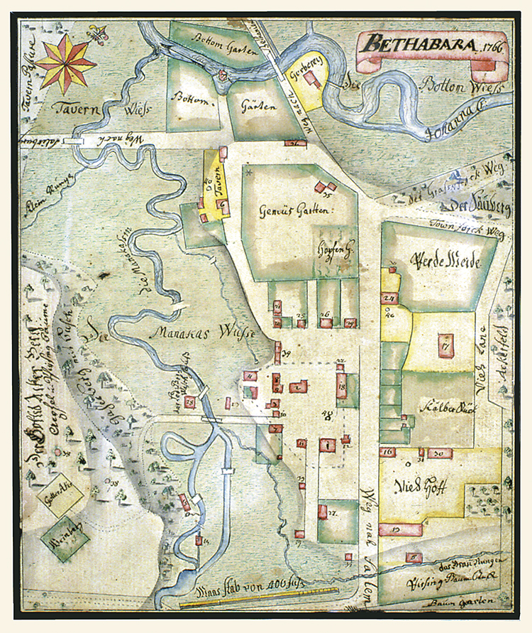 1766 map of Bethabara by Christian Gottlieb Reuter. The brewery is number 5, the red block in the bottom near the stream. (Moravian Archives, Winston-Salem, NC.)
