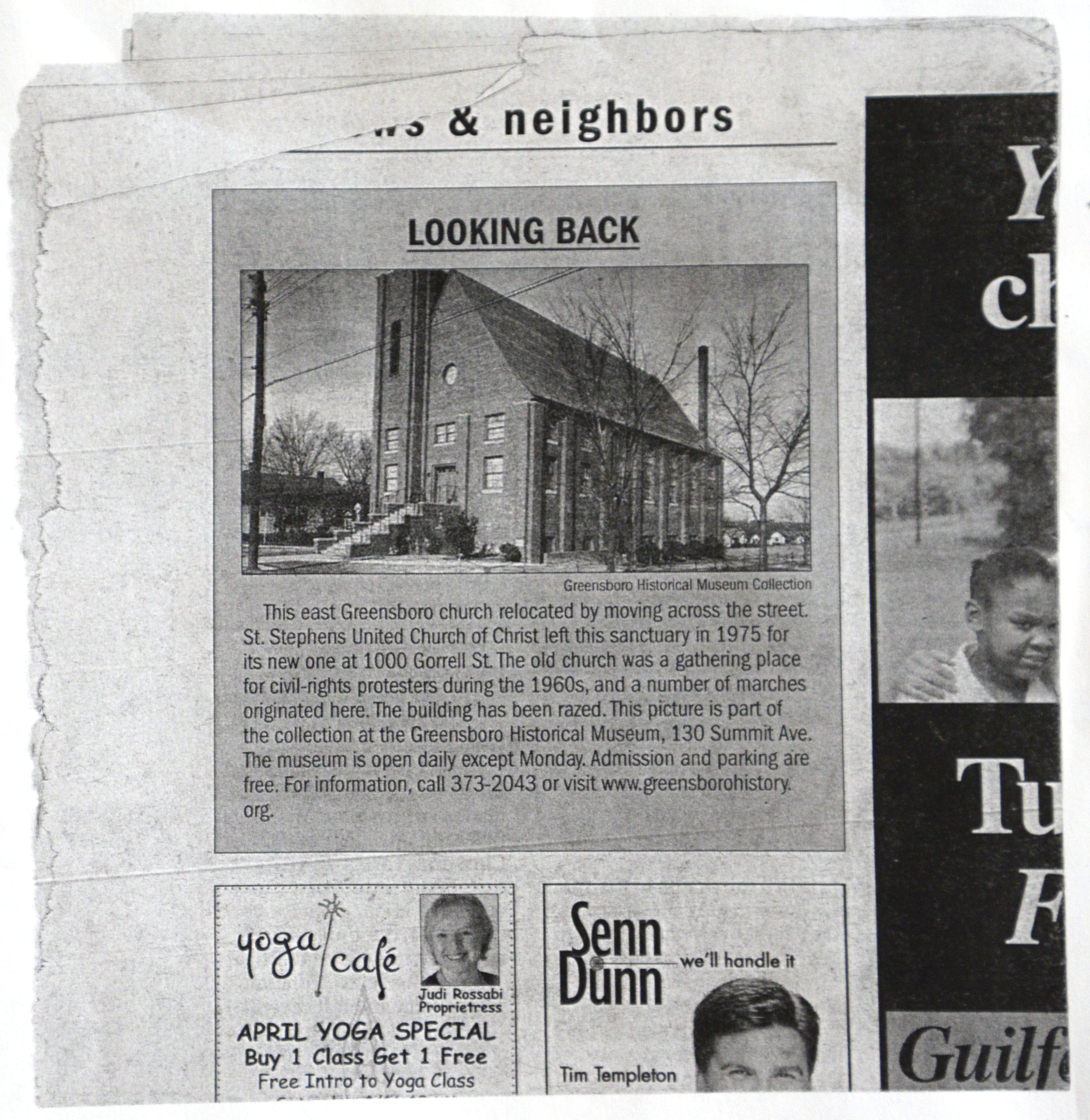 This undated article from the Greensboro News and Record looks back at St. Stephen United Church of Christ and shows the original church building on Gorrell Street, which stood from 1949-1975. It was a meeting place for civil rights organizers in the 1960s.
