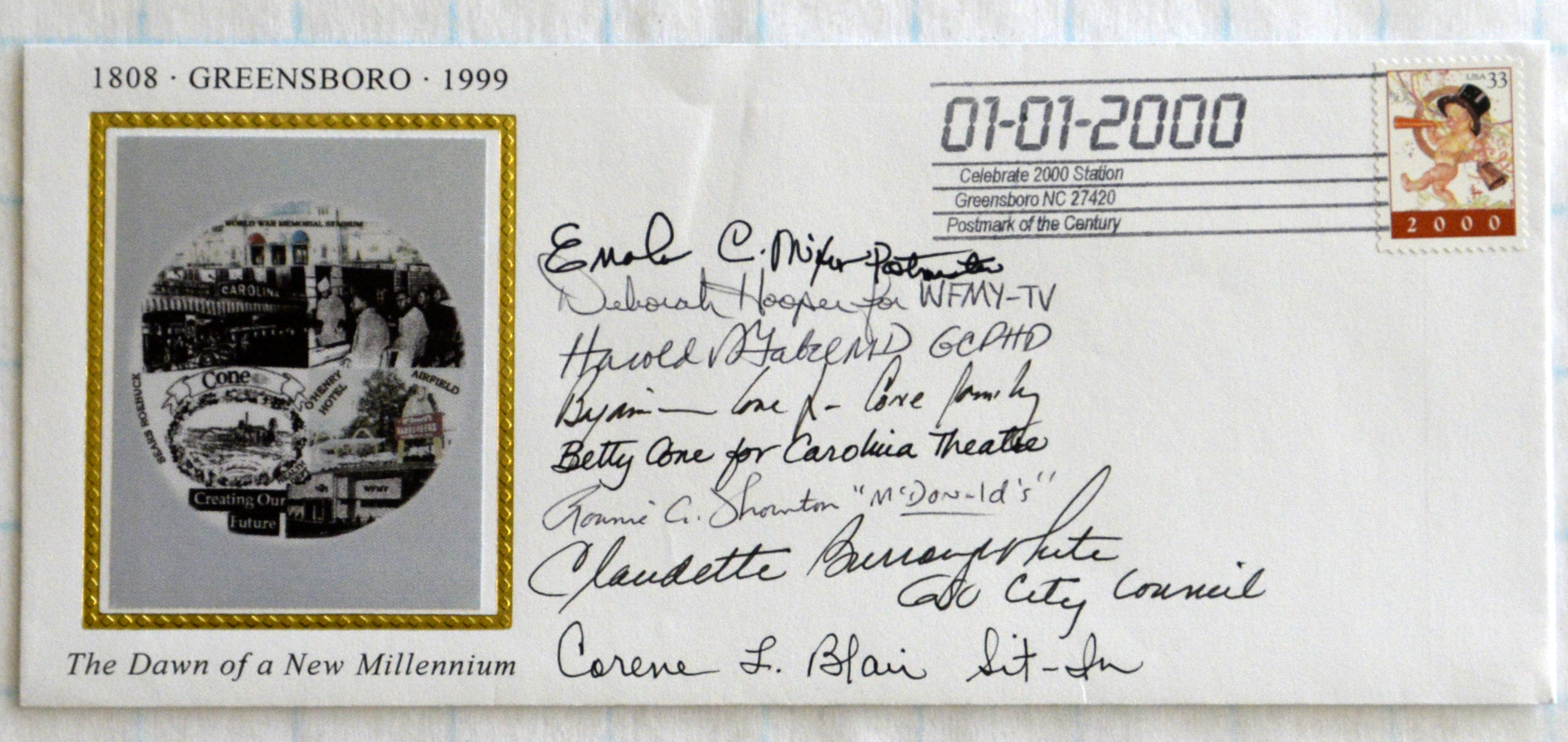 This postal cover commorates the birth of the new millennium on January 1, 2000. Signatures on the cover include Enola C. Mixon, Deborah Hooper, Benjamin Cone, Betty Cone, Ronnie C. Thornton, Claudette Burroughs-White, and Corene L. Blair