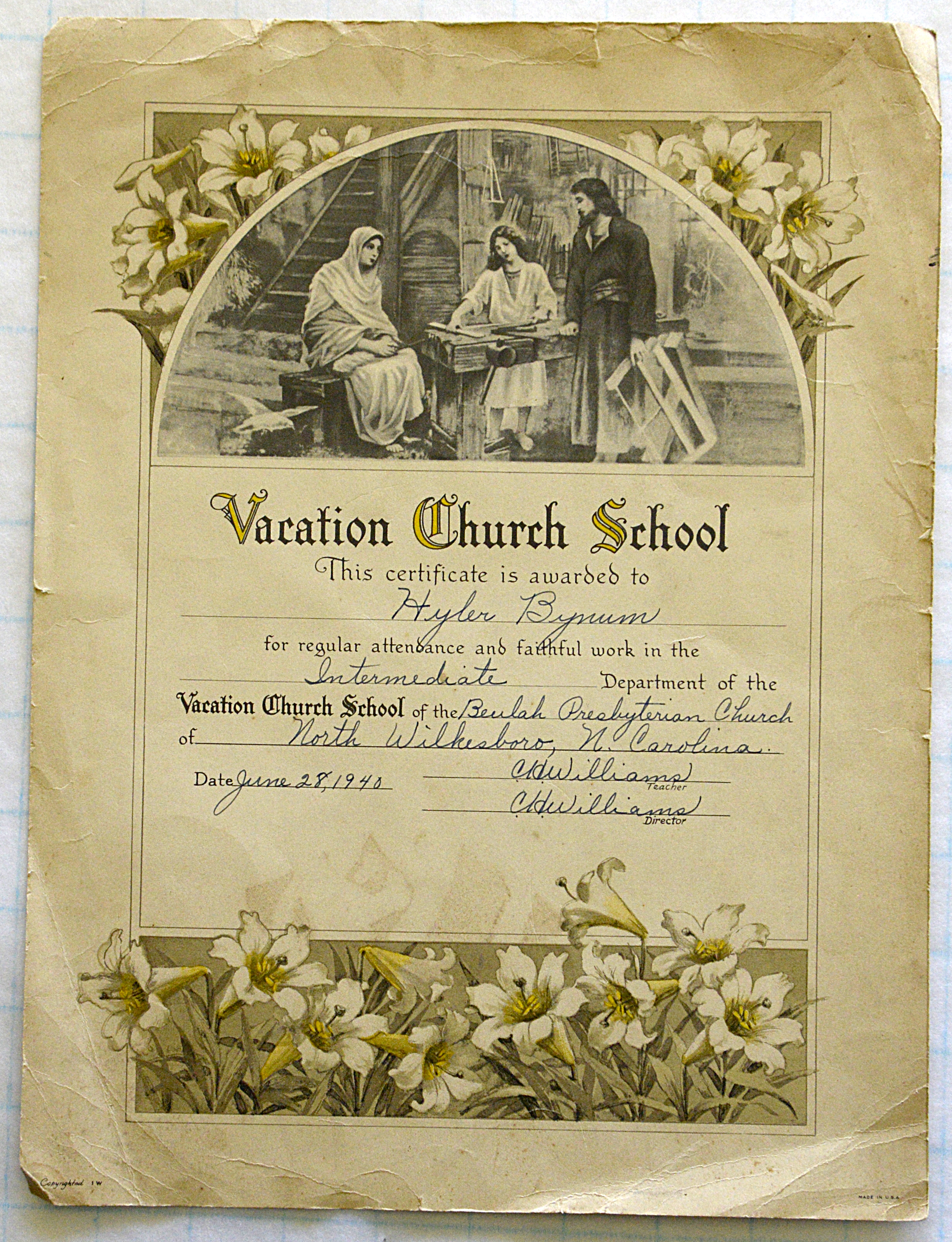This certificate was issued to the thirteen-year-old "Hyler" (Hyla) Bynum (now Cundiff) by the Beulah Presbyterian Church in North Wilkesboro for her faithful attendance in June 1940.