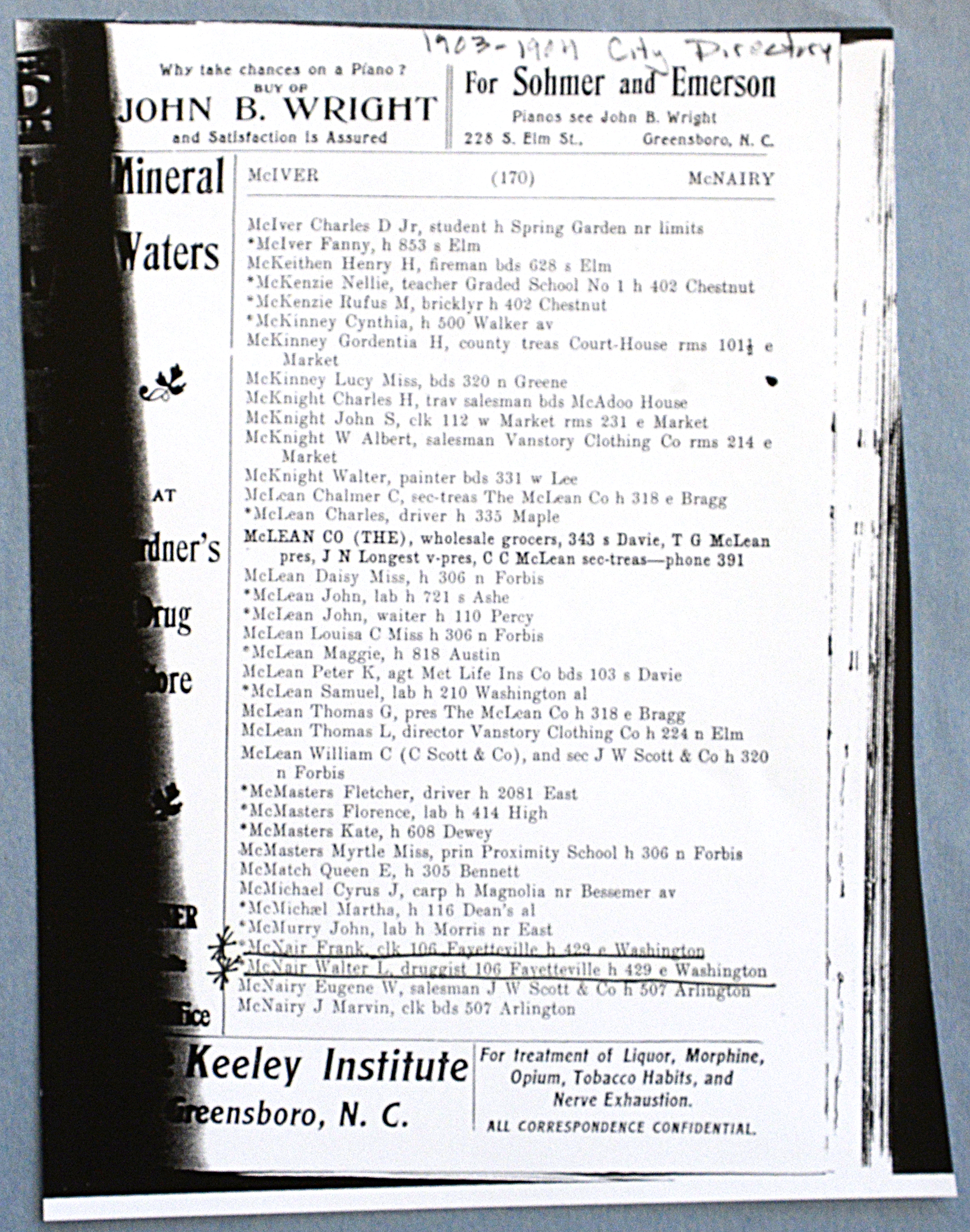 This photocopy of page 170 of the Greensboro City Directory lists Walter McNair's drugstore at 106 Fayetteville Street and his home at 429 East Washington Street.