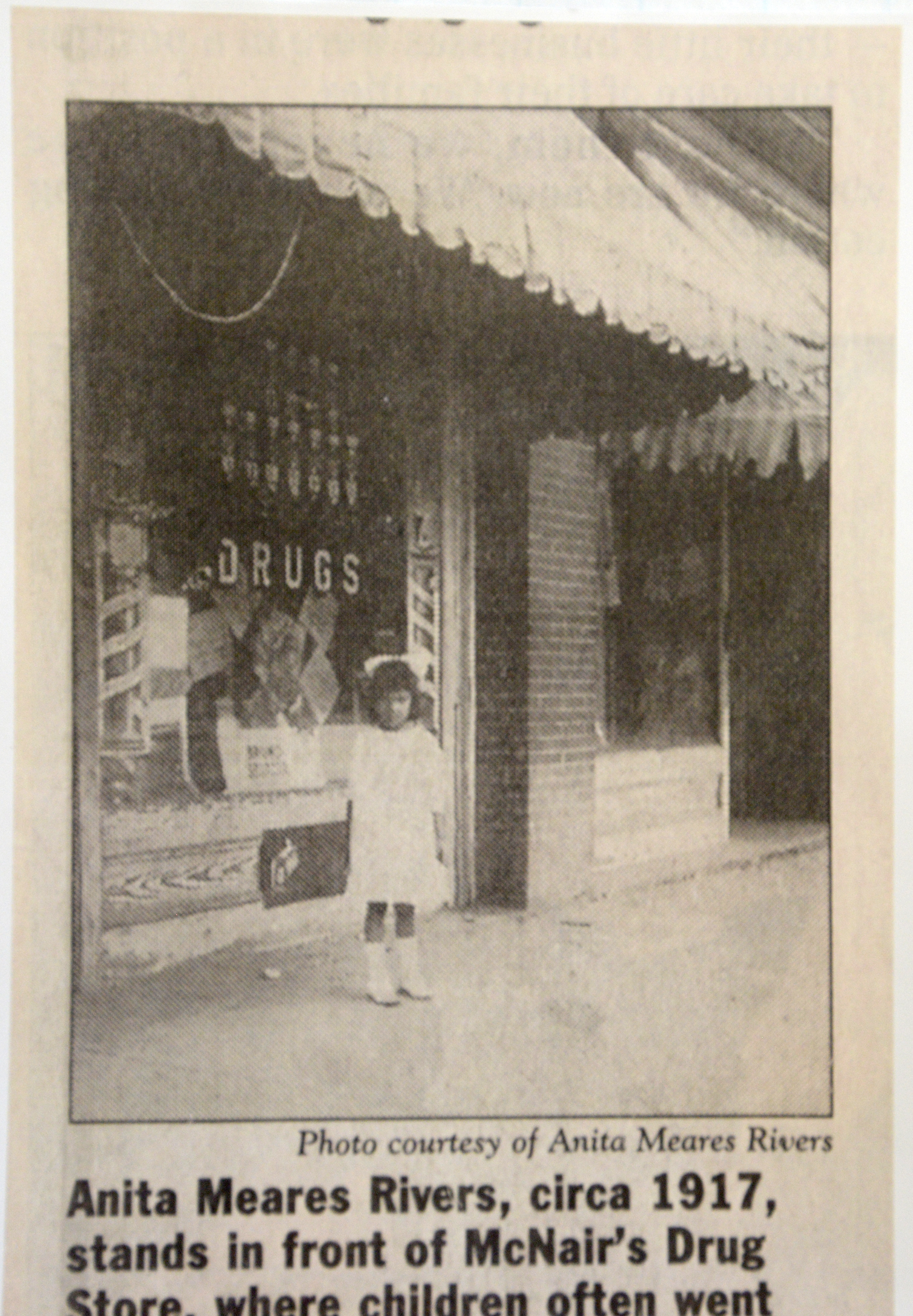 This photograph, printed in an unknown publication, shows the young Anita Mears Rivers standing in front of the McNair drugstore.