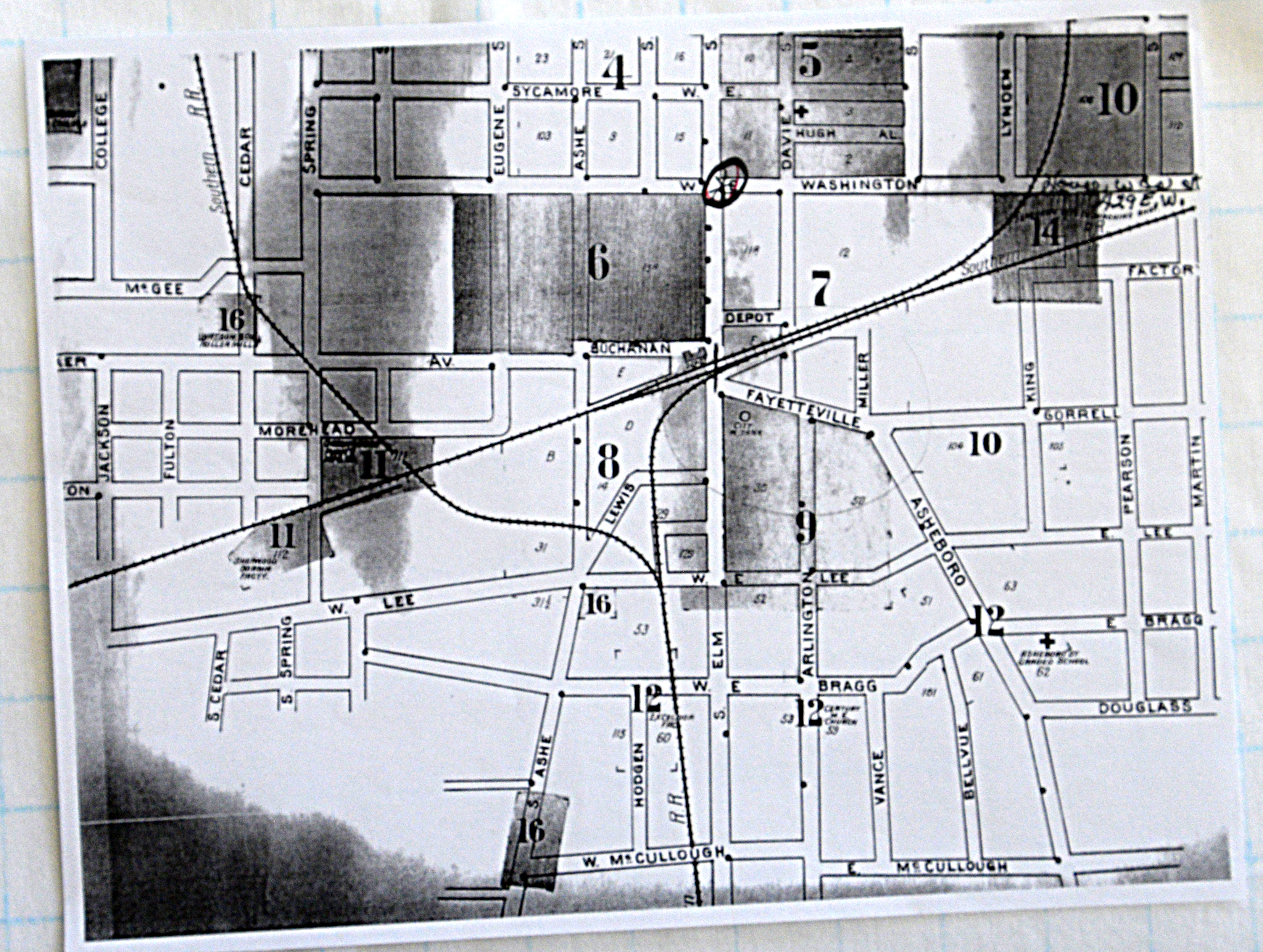 This page from a Sanborn Map gives an overview of Greensboro, especially the area where the McNair family lived and worked.