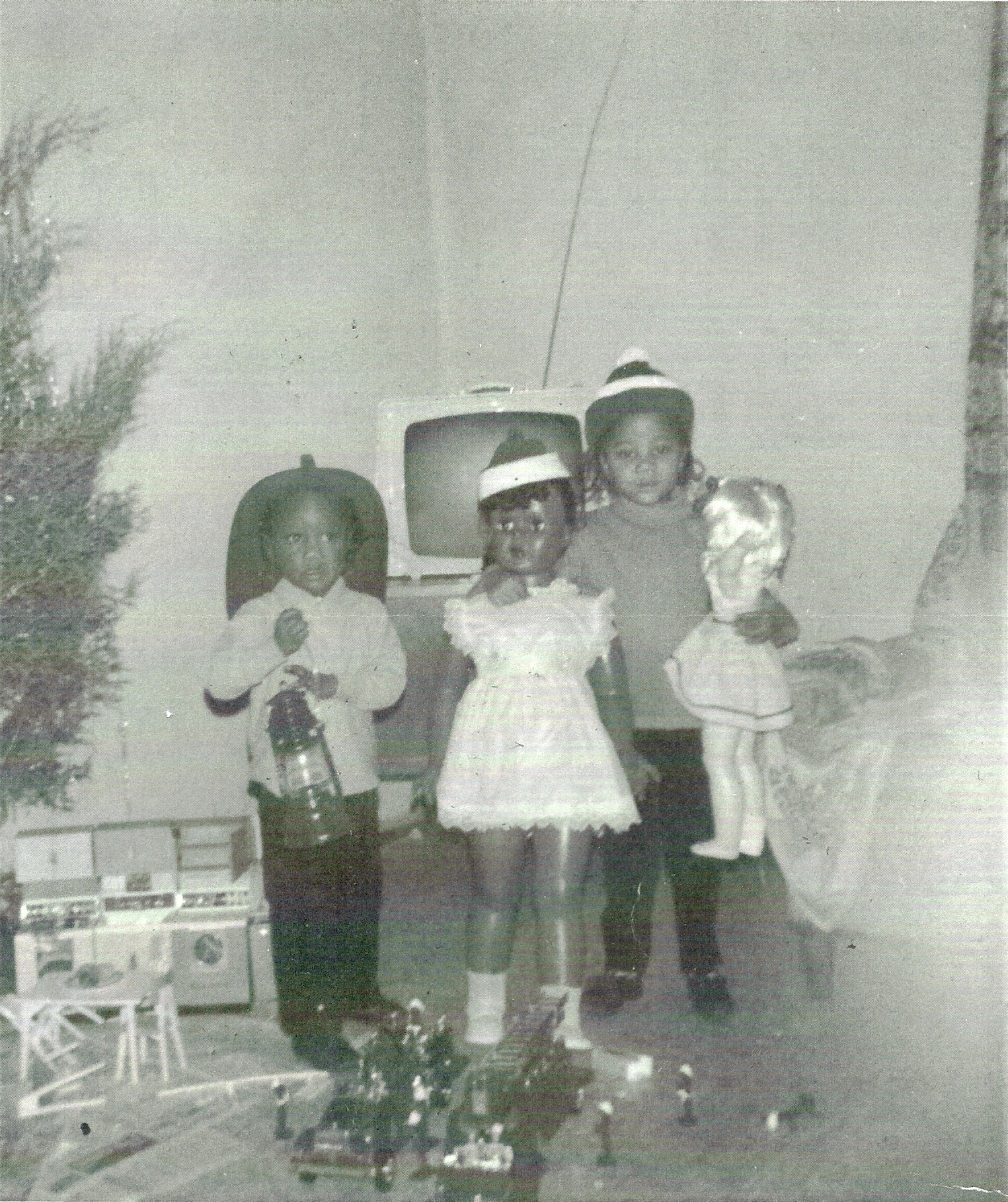 A young African-American girl poses beside a life-size "black girl" doll, while holding a "white girl" doll. The young boy, dressed in a fireman's hat, holds a lantern, with two toy firetrucks on the floor in front of him.