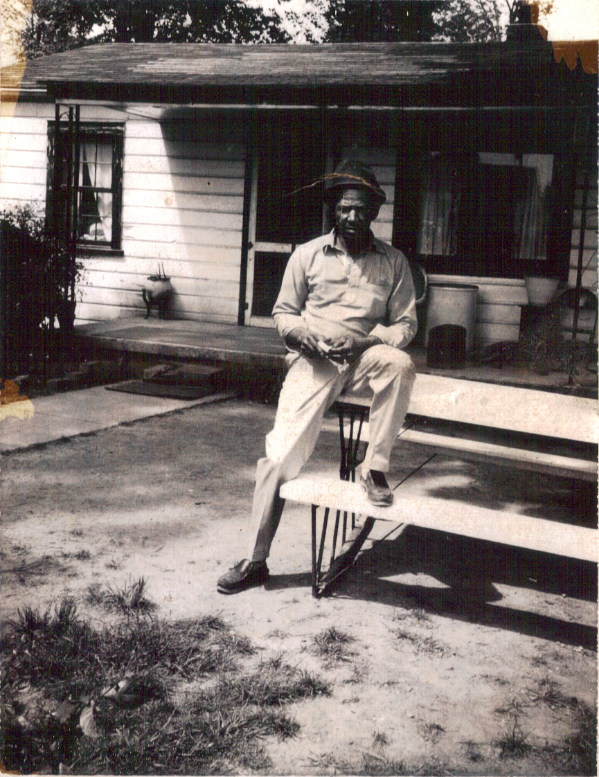 Richard J. Pressley sitting on picnic table behind a house
