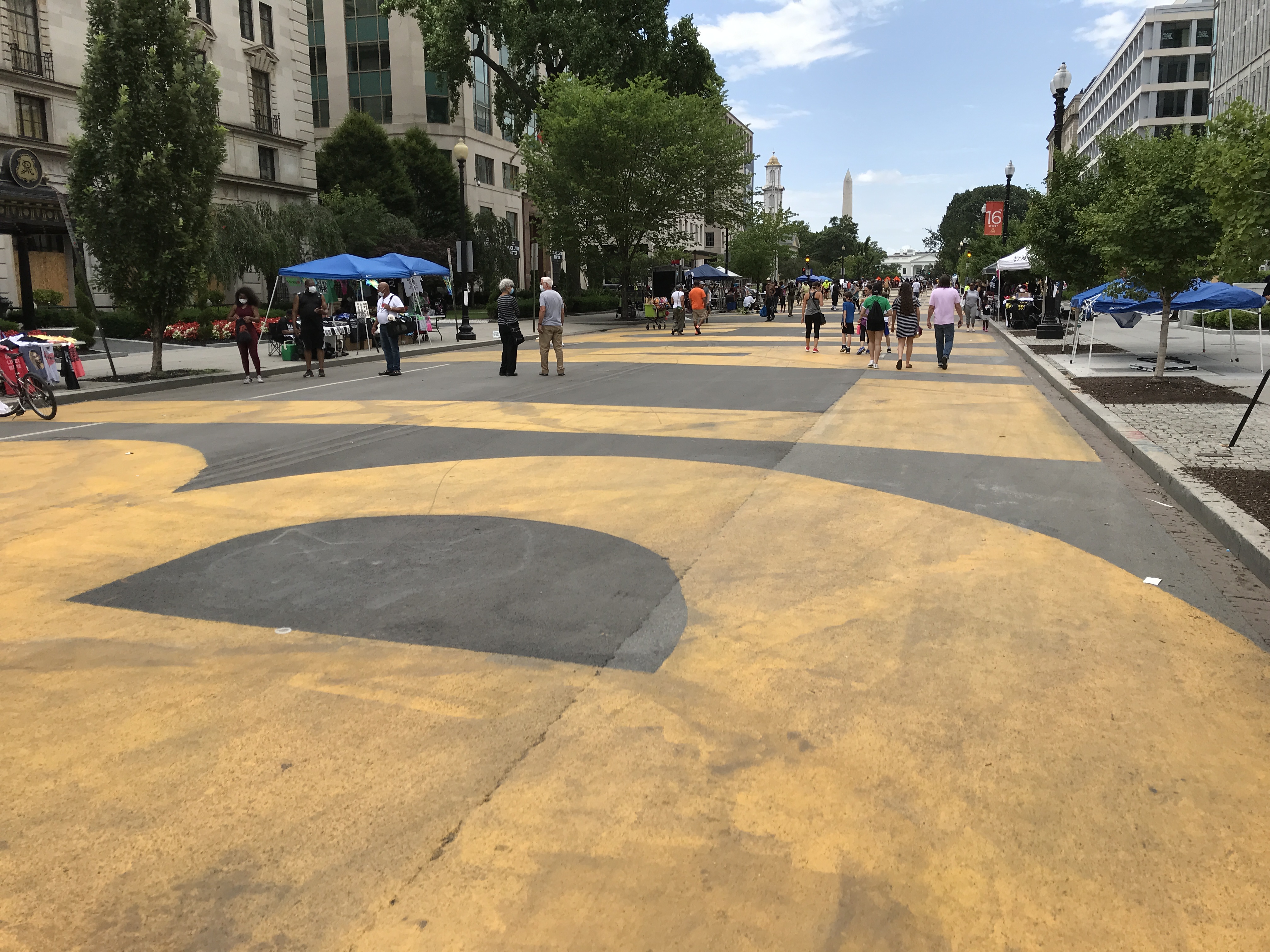Protest signs and site visitors in Black Lives Matter Plaza, along 16th Street NW in Washington during the Black Lives Matter and George Floyd demonstrations in 2020..