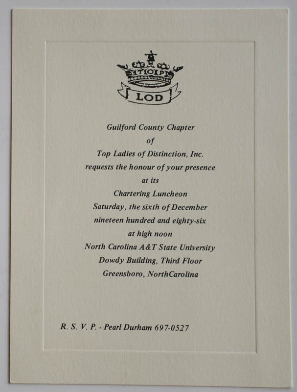 Invitation for Pearl Durham to attend the Guilford Chapter of the Top Ladies of Distinction Inc. luncheon.