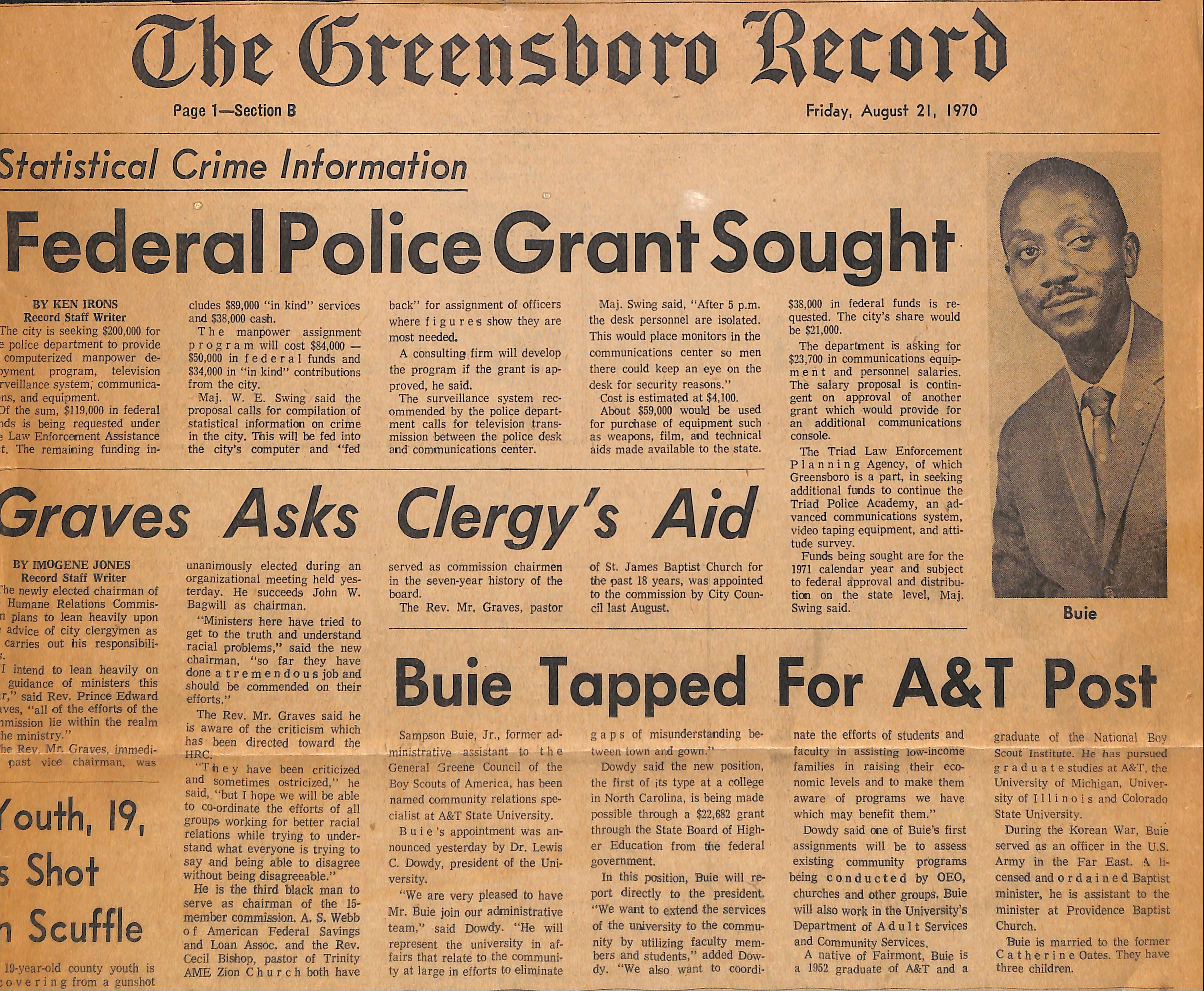 Article from the Greensboro Record anouncing Sampson Buie, Jr. as new communications specialist at A&T State University.