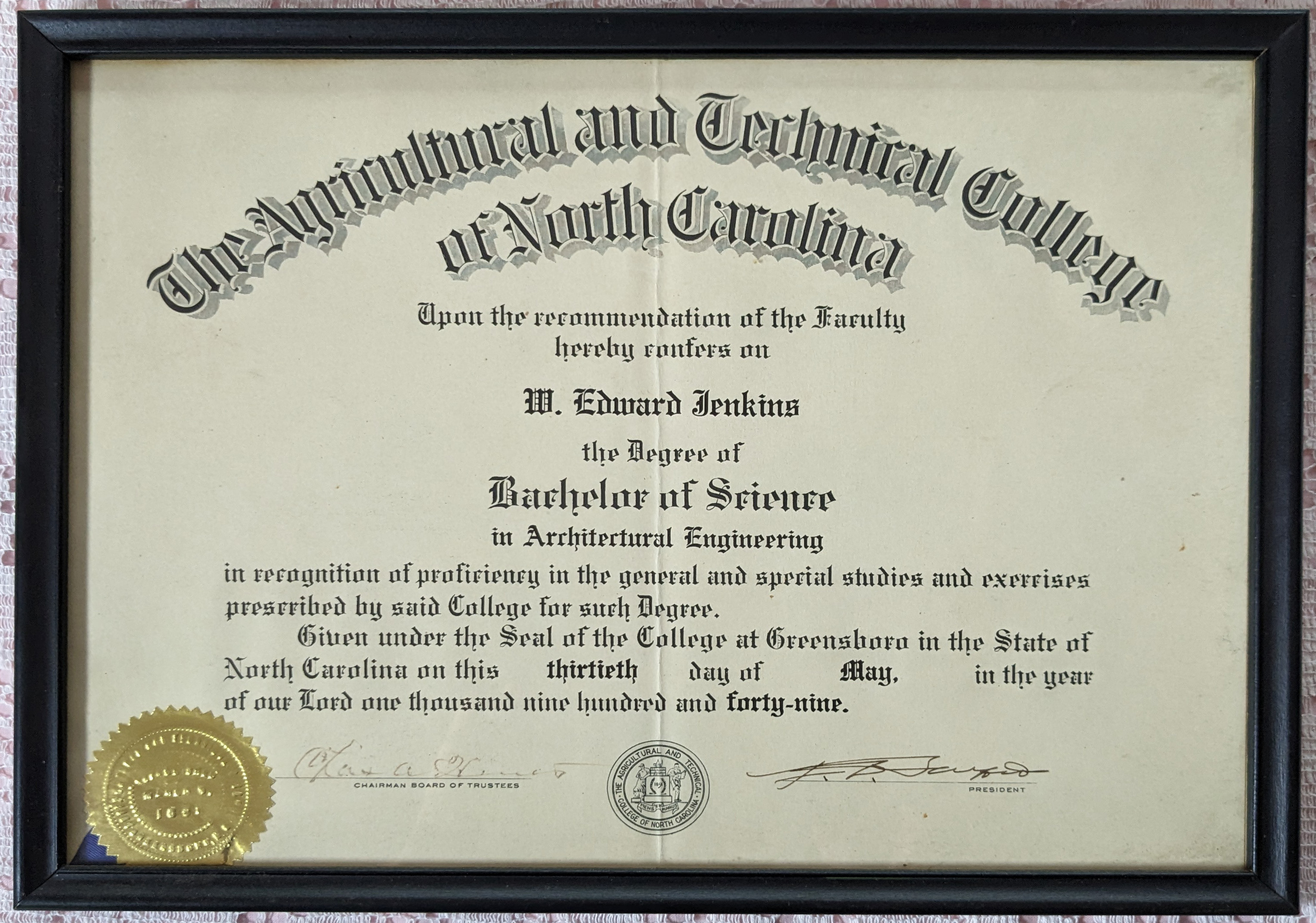 Degree awarded to W. Edward Jenkins by The Agricultural and Technical College of North Carolina (now N.C. A&T State University).