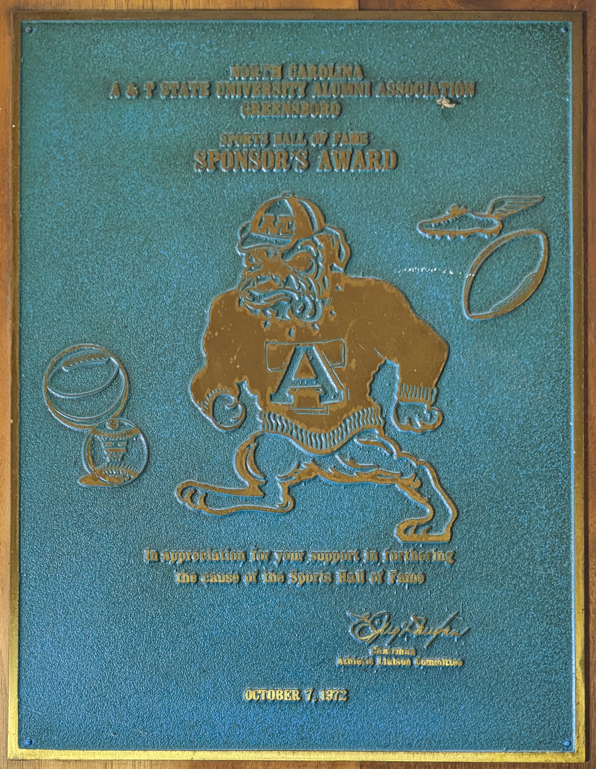 Plaque honoring W. Edward Jenkins as a sponsor of the N.C. A&T State University Sports Hall of Fame.