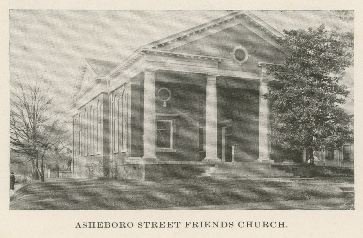Exterior of the Asheboro Street Friends Church on Asheboro Street (now Martin Luther King Jr. Drive) at Lee Street (now East Gate City Boulevard) in Greensboro.