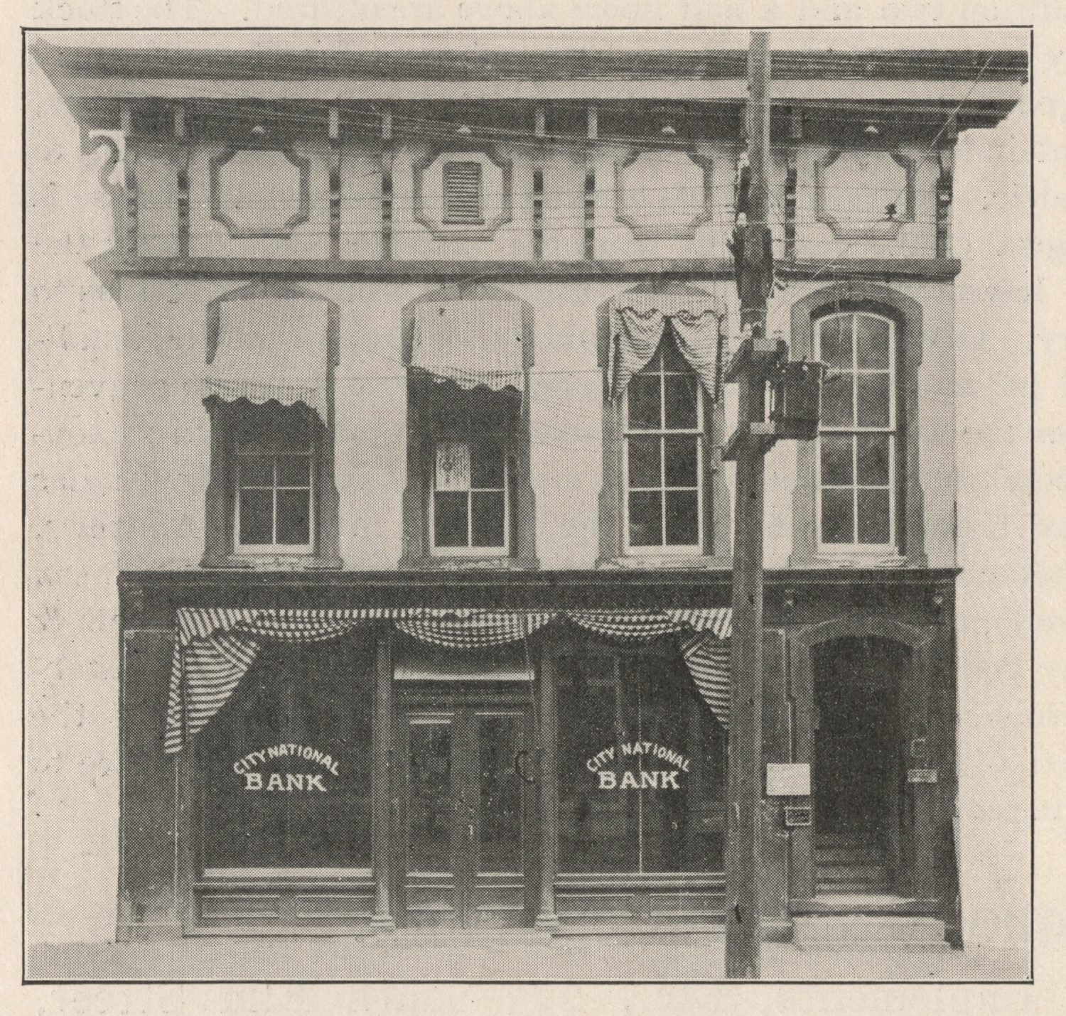 Exterior of the City National Bank at 119 South Elm Street in Greensboro. This was later the site of the Banner Building, which opened in 1912 and was destroyed in the 1970s. Image taken from "Progressive Greensboro: The Gate City of North Carolina" (1903).