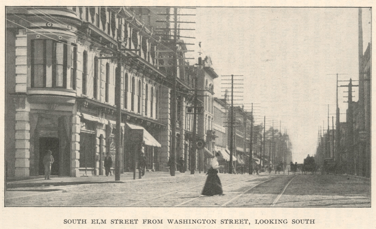 View looking south on Elm Street from Washington, showing the McAdoo House hotel (left) at 301-311 South Elm Street in Greensboro. Image taken from "Progressive Greensboro: The Gate City of North Carolina" (1903).