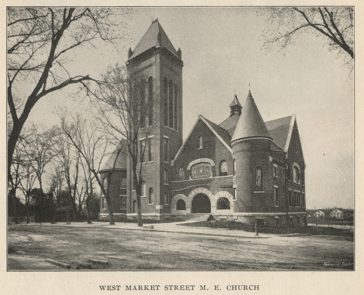 Exterior of the West Market Street Methodist Episcopal Church on West Market Street at Library Place (now John Wesley Way) in Greensboro. Image taken from "Progressive Greensboro: The Gate City of North Carolina" (1903).