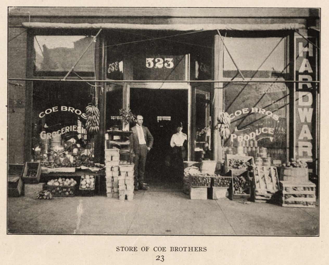 Exterior of the Coe grocery store at 523 South Elm Street in Greensboro. The store remained open until at least 2015, although it apparently relocated to 529 South Elm at some point. Image taken from "Southward the sun of progress shines" (1906).