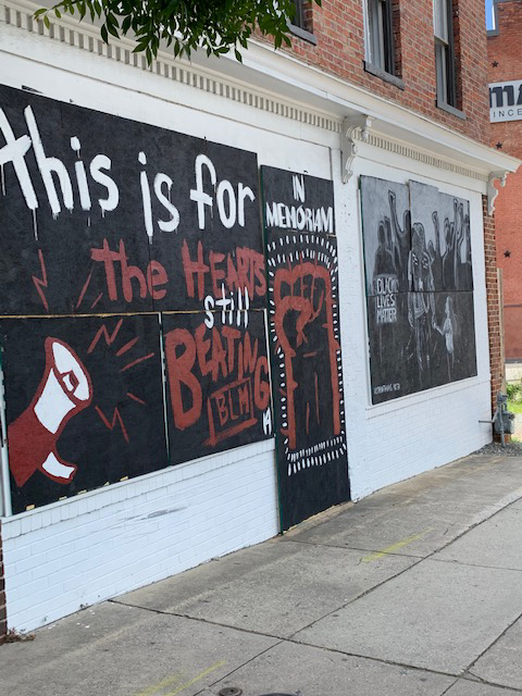 Protest art and street mural created on South Elm Street in Downtown Greensboro during the Black Lives Matter and George Floyd demonstrations in 2020.