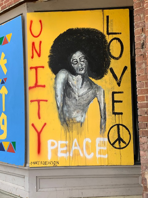 Protest art and street mural created on South Elm Street in Downtown Greensboro during the Black Lives Matter and George Floyd demonstrations in 2020.