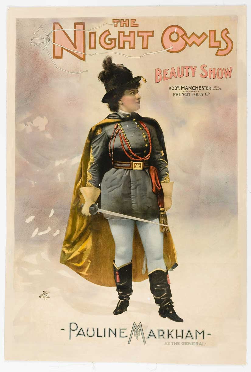 Lithograph poster advertising 'The Night Owls Beauty Show' starring Pauline Markham (1847-1919). Poster is in color and is estimated to be dated 1891. The show was produced by the Robert Manchester French Folly Company.