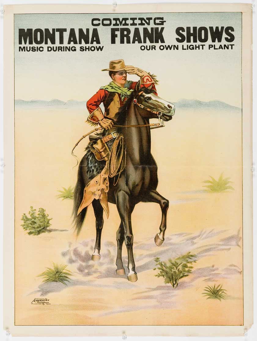 Lithograph poster advertising coming 'Montana Frank Shows.' The poster states that there is music during the show and that the company has their own light plant. The poster is in color, depicting a cowboy on a horse in the desert looking off into the distance. The poster is estimated to be dated around 1897.