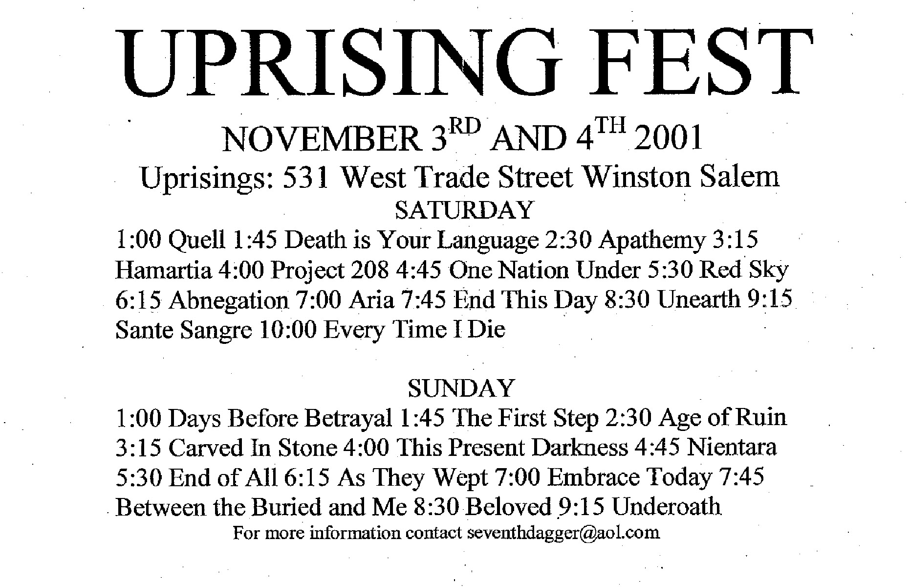 Days Before Betrayal, First Step, Age Of Ruin, Carved In Stone, This Present Darkness, Nientara, End Of All, As They Wept, Embrace Today, Between The Buried And Me, Beloved, Underoath