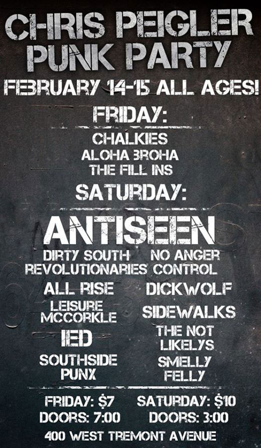 Antiseen, Dirty South Revolutionaries, All Rise, Leisure Mccorkle, IED, South Side Punx, No Anger Control, Dickwolf, Sidewalks, Not Likelys, Smelly Felly