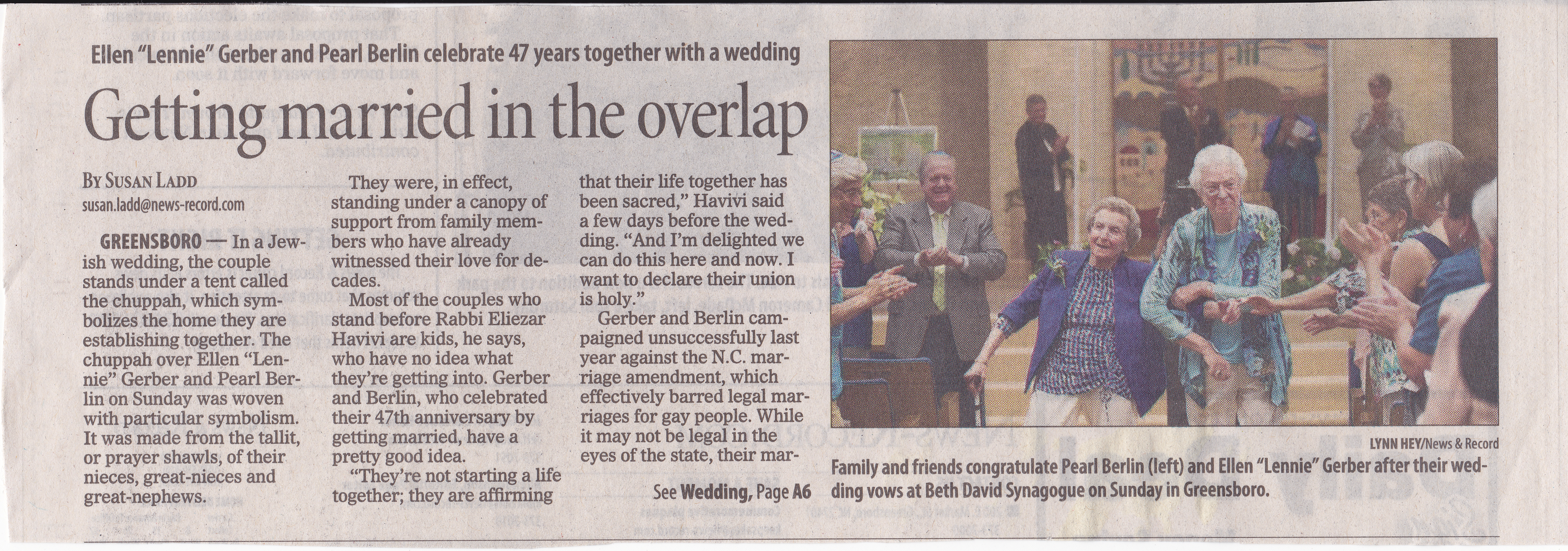 Ellen W. (Lennie) Gerber and Pearl Berlin were married in 2013. Theirs was the first same-sex wedding performed at Beth David Synagogue in Greensboro.