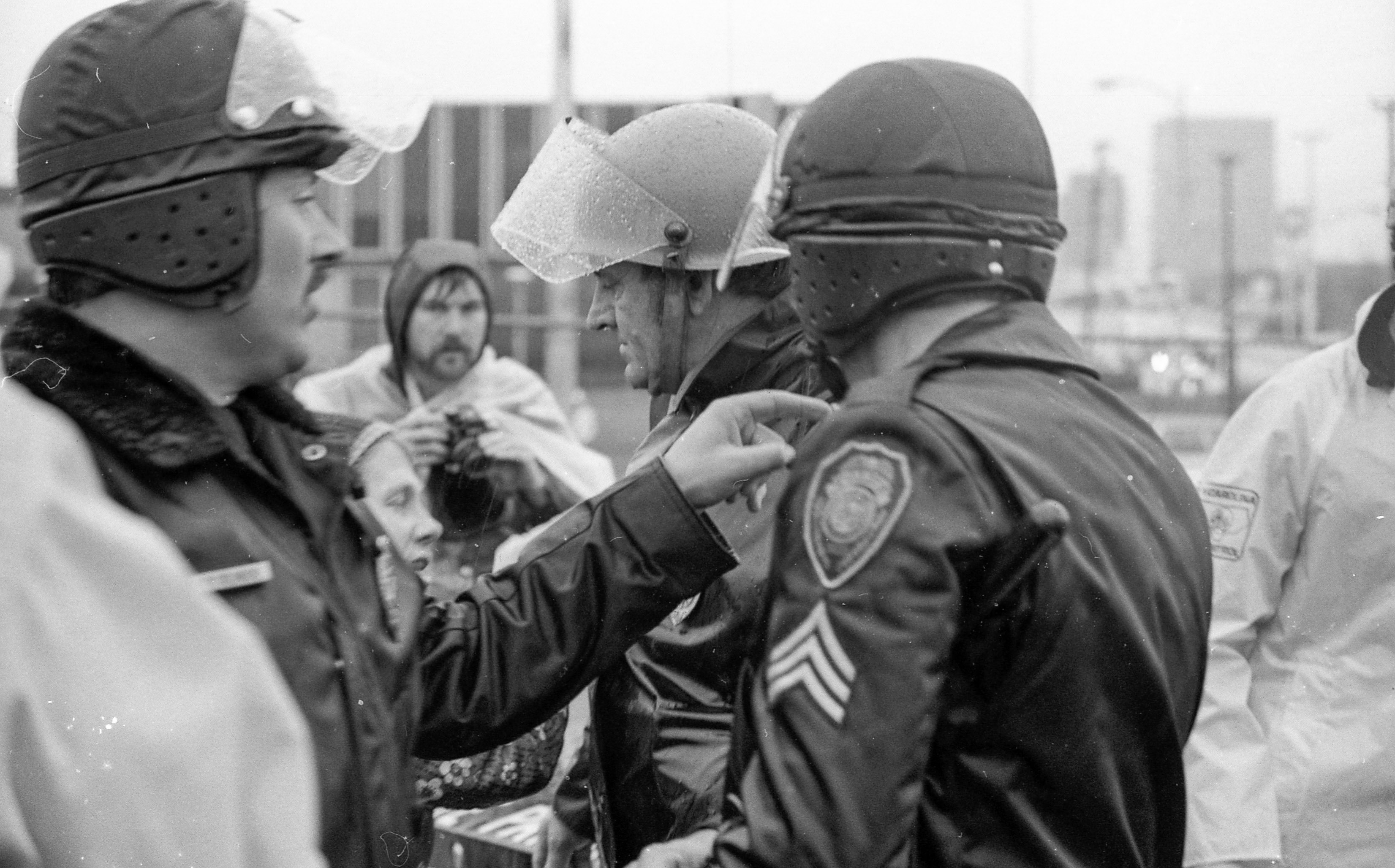 Law enforcement at a funeral march commemorating the victims of the 1979 Greensboro Massacre. Photograph taken near the intersection of East Market Street and East Friendly Avenue in Greensboro.