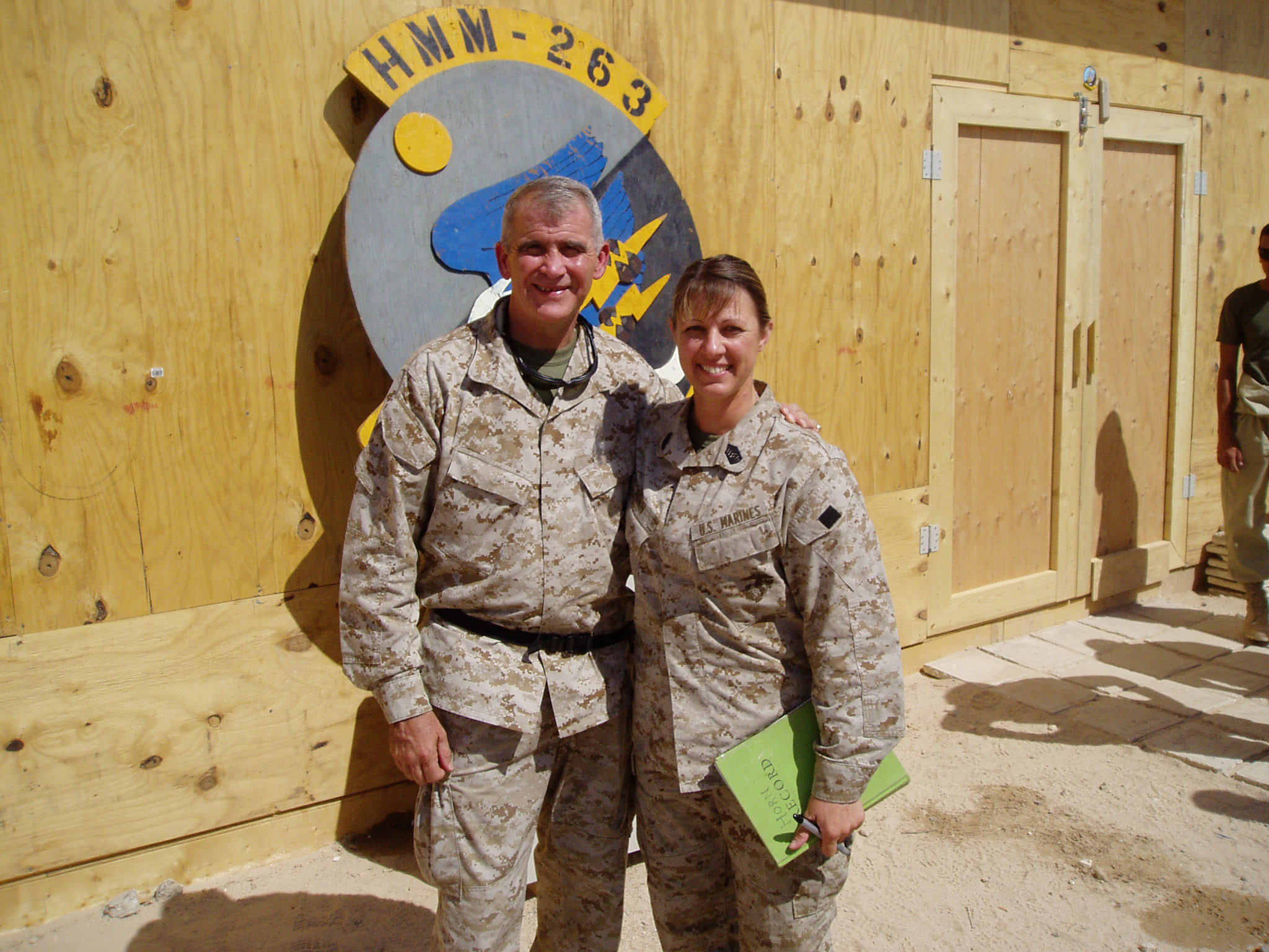 Gail S. Horn poses with Oliver "Ollie" North, a former United States Marine Corps. lieutenant colonel., at Camp Al-Taqaddum, Iraq.