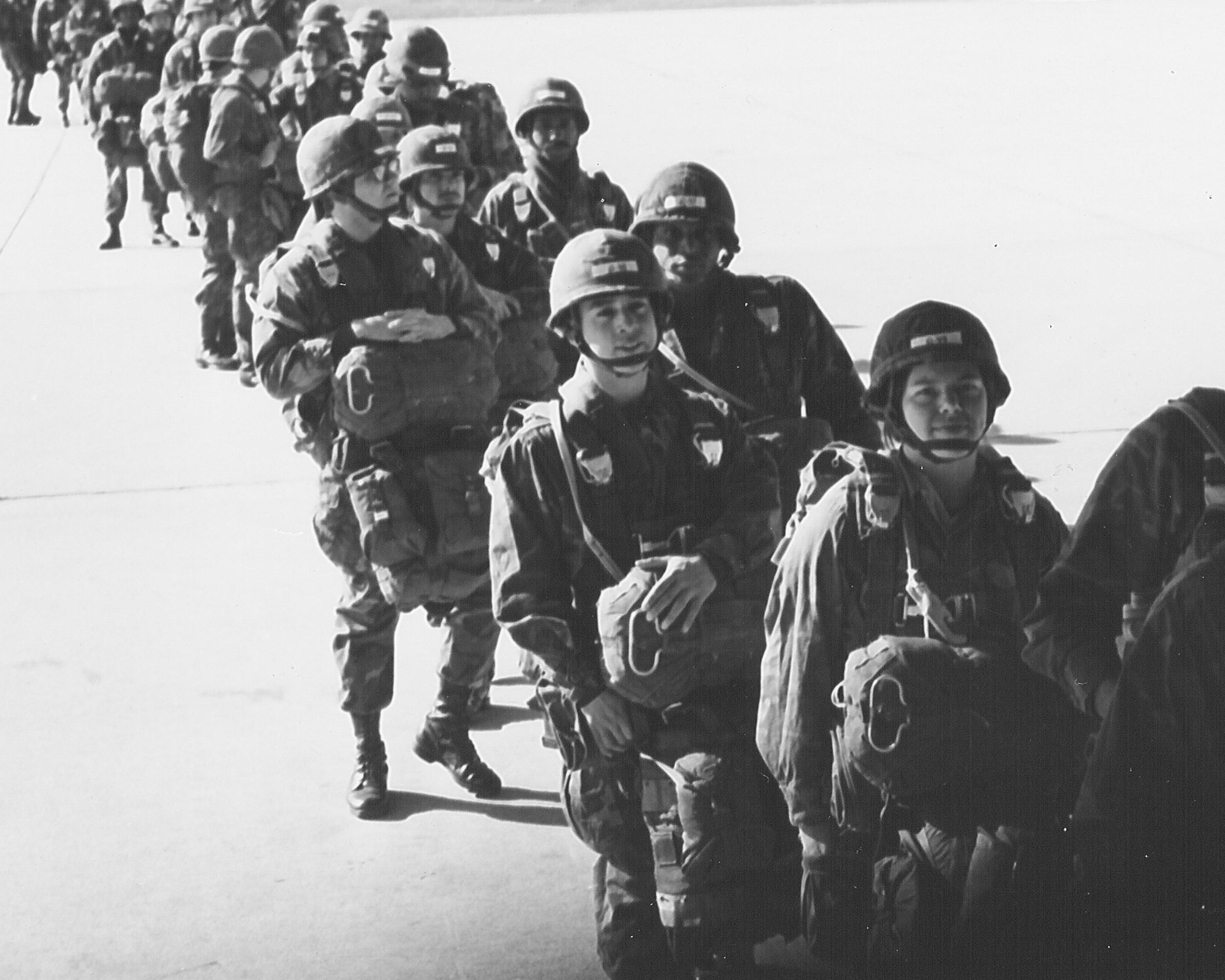 This photograph shows Donna Tabor in line with other members of the 82nd Airborne Division at Eglin Air Force Base in Valparaiso, Florida, getting ready for a jump. They are seen in camouflage with their static line-deployed parachutes.
