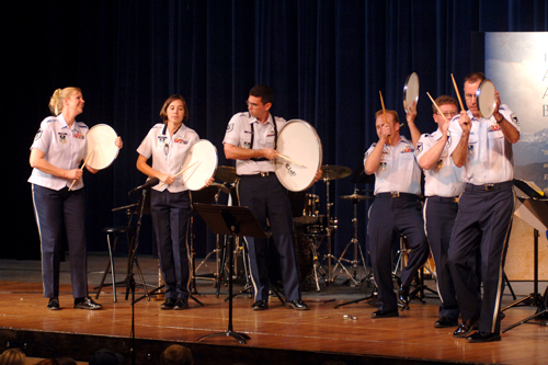 This photograph shows a performance of Academy Winds, an ensemble of members of The United States Air Force Academy Band. Master Sergeant Cheryl Sizer is first from left.