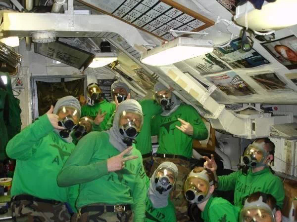 Elizabeth Ann Carlin and others are seen wearing gas masks during a General Quarters drill.