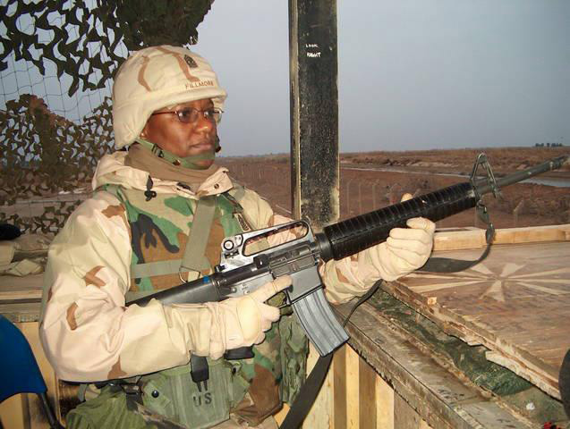 Sergeant Major Theressa Jeanne Fillmore on guard duty while stationed in Iraq.