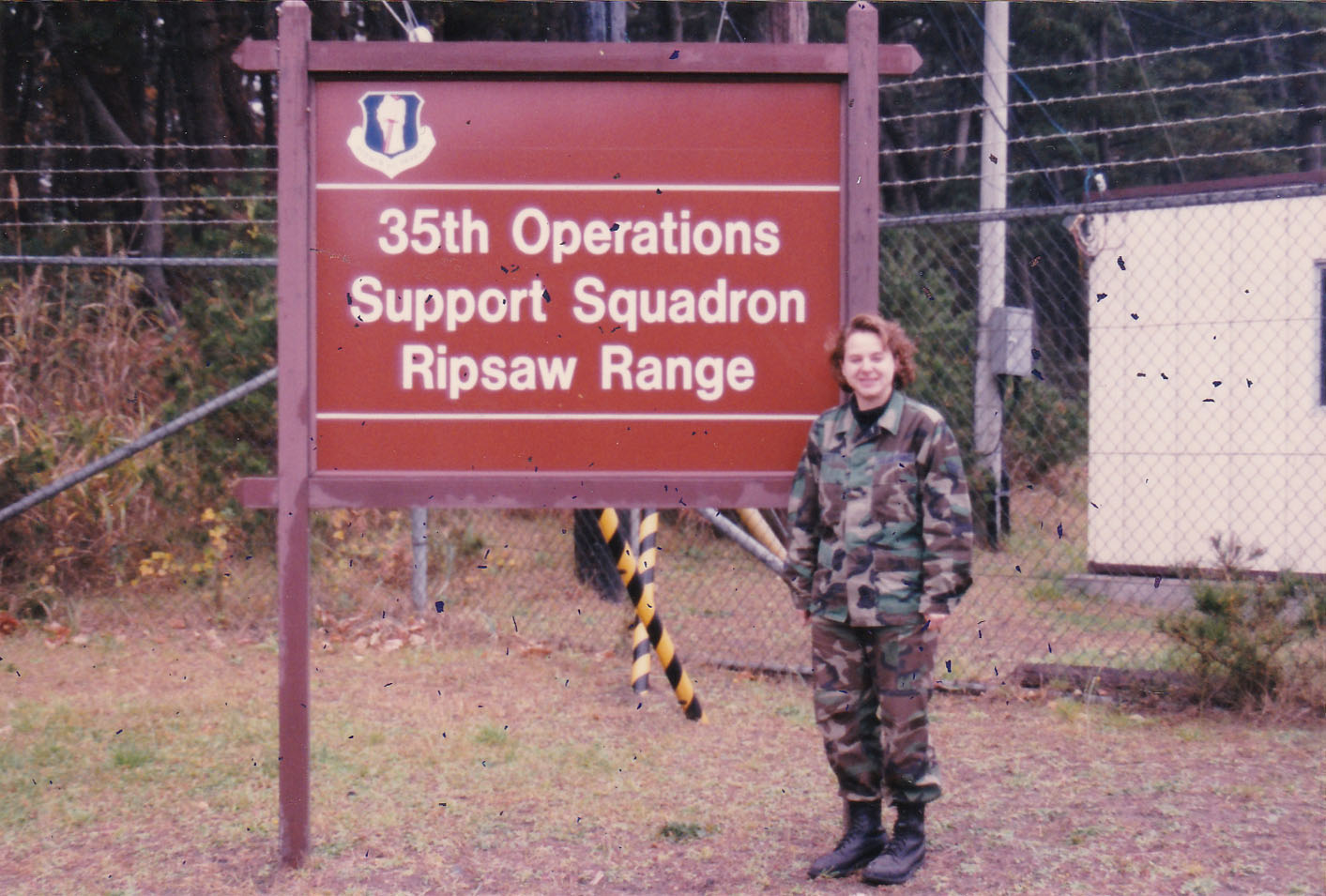 Cherise Miller-March standing in front of the sign for Ripsaw Range at 35th Operations Support Squadron, Misawa Air Base, Japan.