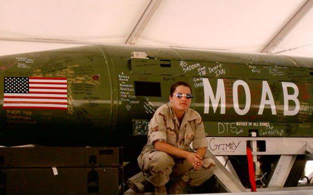 Paula G. Flores poses in front of a MOAB, or Massive Ornance Air Blast.