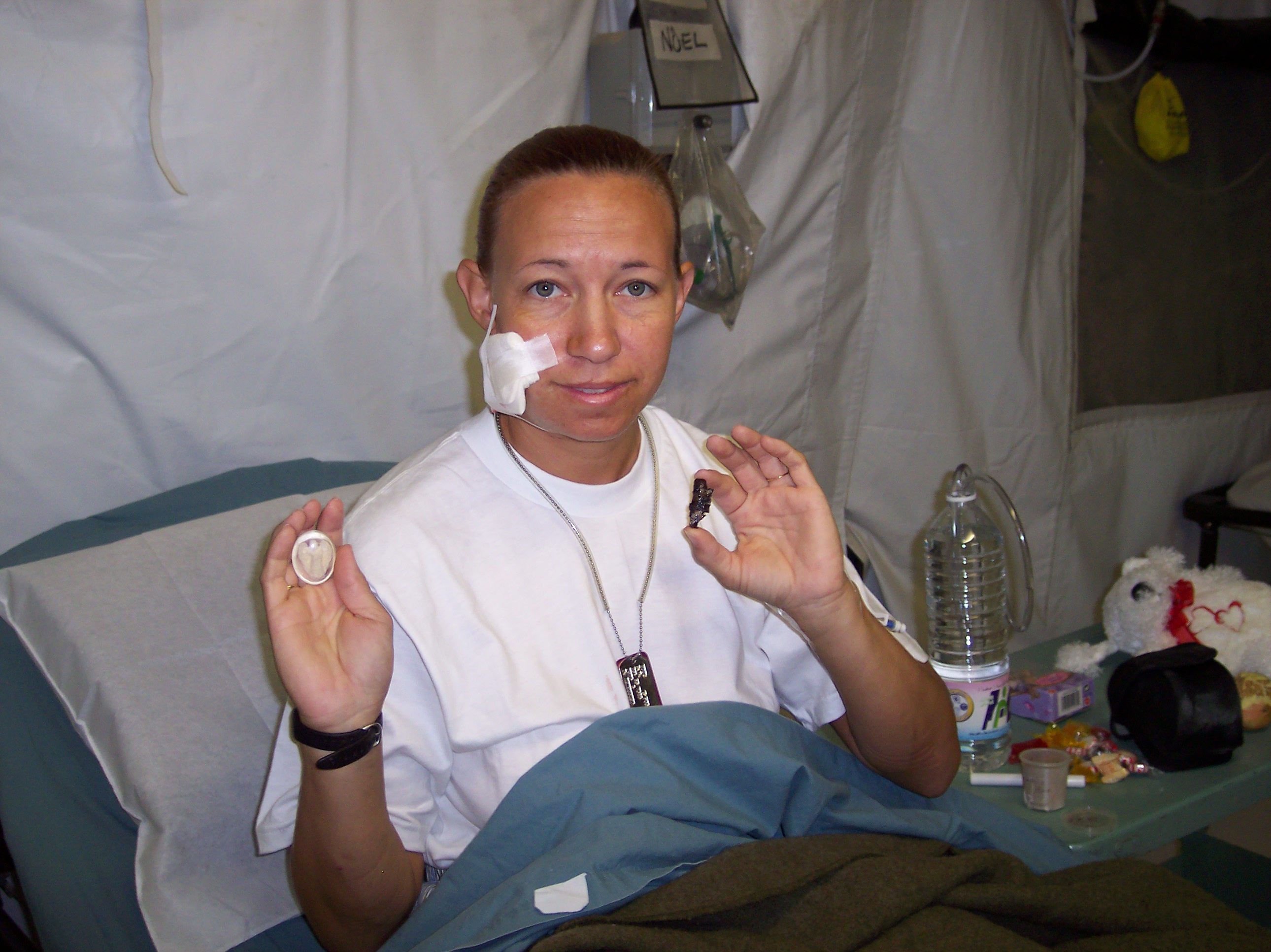 In her left hand, Rosie Noel holds the shrapnel that wounded her, circa 2005. In her right hand, she holds a stone with an angel etching. This was in her pocket when she was hit and has special significance for her. Noel is seated in a hospital bed and wears a bandage covering her wound.