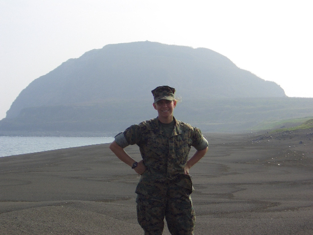 Rosie Noel poses on a beach in her Marine Corps Combat Utility Uniform in woodland camouflage, circa 2005.