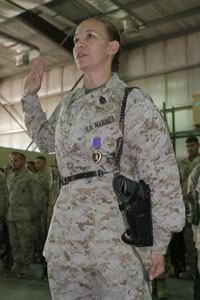 Rosie Noels takes an oath, circa 2005. She wears the Marines Corps Combat Utility Uniform in desert camouflage.