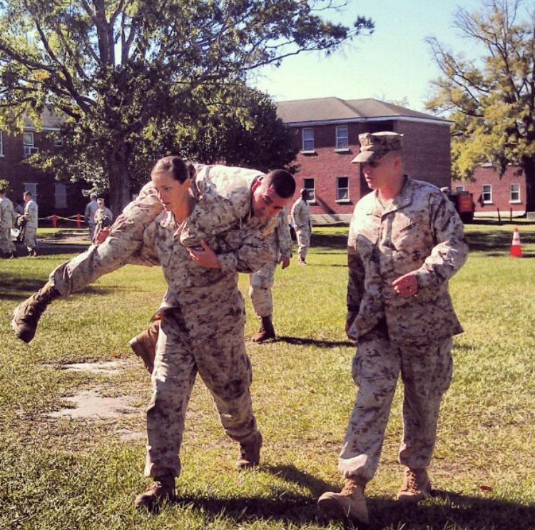Stephanie Weber carries another soldier during training at Camp Lejeune, North Carolina; circa 2011