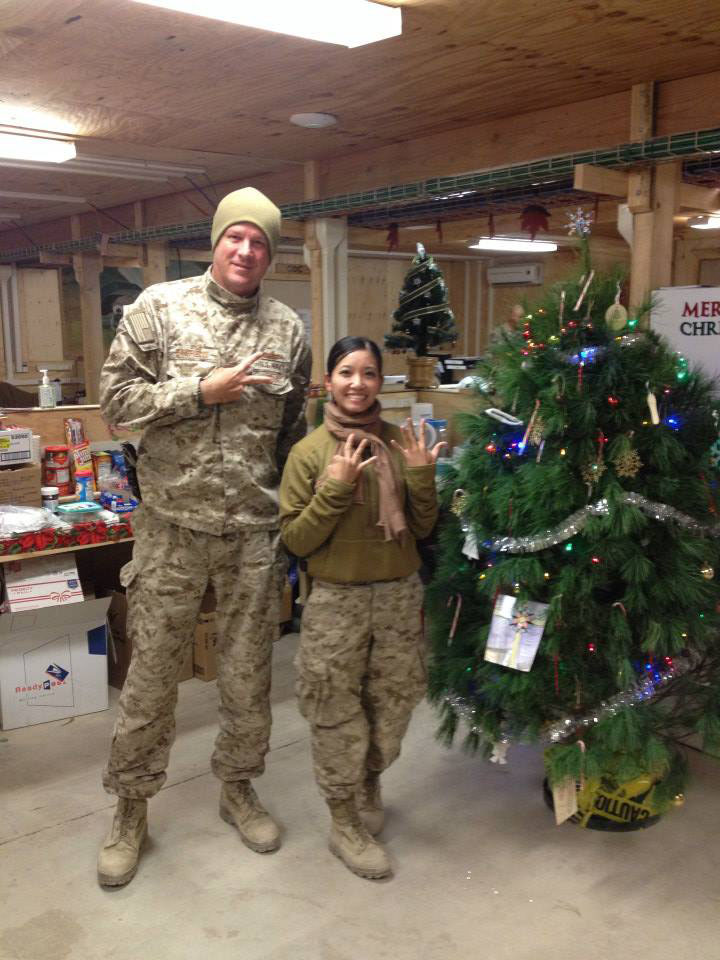 Niddie Miyo, right, poses with a fellow sailor during the holidays.