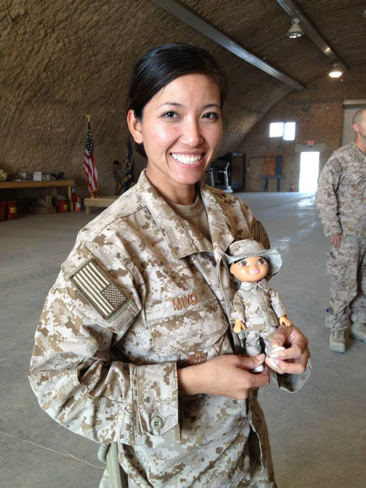 Niddie Miyo poses with a doll wearing miniature camouflage fatigues