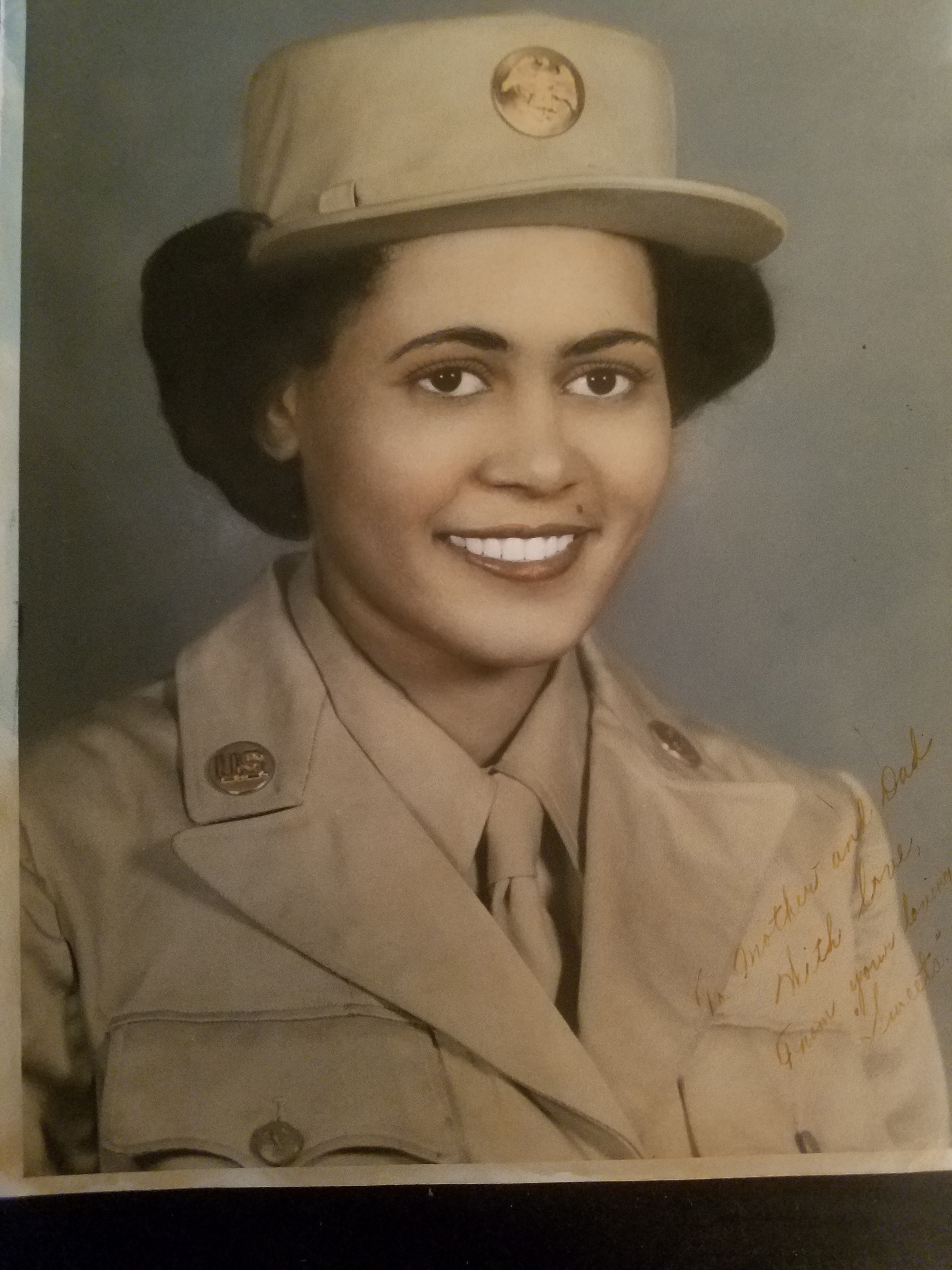 Formal Portrait of Romay Catherine Johnson Davis in uniform. Caption reads: To Mother and Dad, With Love, From your loving "Sweets"