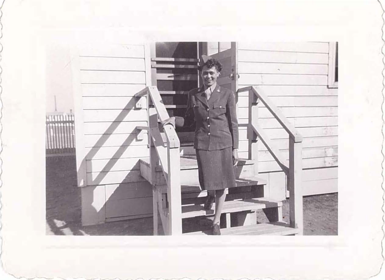 Black and white photograph of Romay Catherine Johnson Davis in uniform, standing on steps