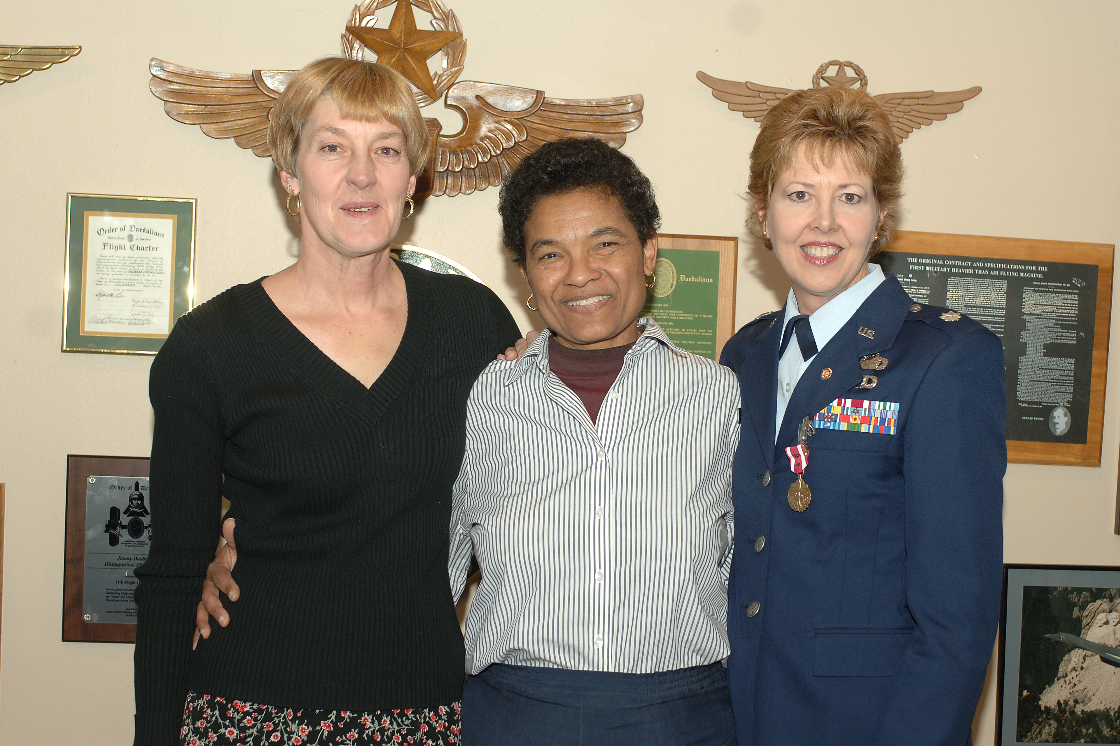 Lieutenant Colonel Kathryn Wirkus (right) poses with her sister Lydia Wirkus and her cousin Leslie Poisson after her retirement ceremony, circa 2005. She wears the air force service dress uniform and the Meritorious Service medal. Some of the ribbon bars she wears include: Air Force Training Ribbon, Small Arms Expert Marksmanship Ribbon, Air Force Achievement Medal, Meritorious Service Medal, Air Force Commendation Medal, Joint Service Commendation Medal, Defense Meritorious Service Medal, and Global War on Terrorism Medal.