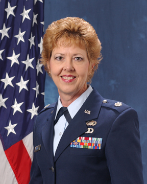 Official portrait of Lieutenant Colonel Kathryn Wirkus, taken at her retirement, circa 2005. She wears the air force service dress uniform with the Air Force Training Ribbon, Small Arms Expert Marksmanship Ribbon, Air Force Achievement Medal, Meritorious Service Medal, Air Force Commendation Medal, Joint Service Commendation Medal, Defense Meritorious Service Medal, and Global War on Terrorism Medal.