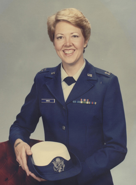 Portrait of Kathryn Wirkus as a captain, circa 1985. Wirkus, seen from the waist up, wears the air force service dress uniform and holds her hat.