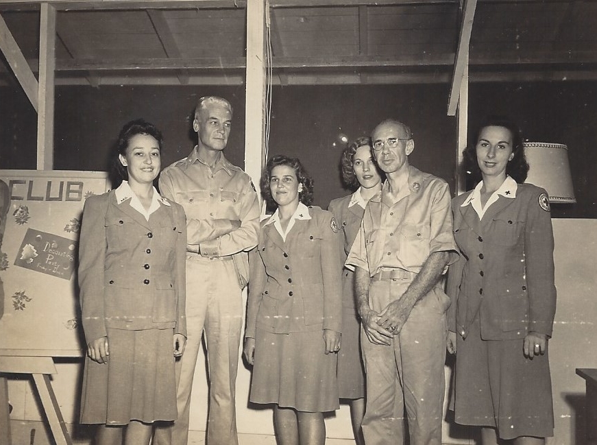 Red Cross workers pose with Admiral Chester Nimitz in Guam.