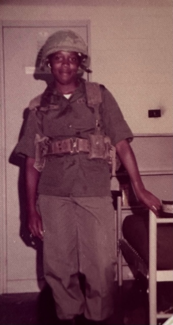Sandra Webb in the barracks. She wears a work utility uniform.