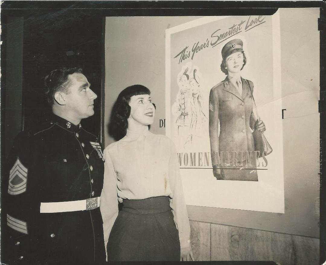 Male USMC Master Sergeant and Theresa Sosnowski Kerr look at a Women Marines recruiting poster