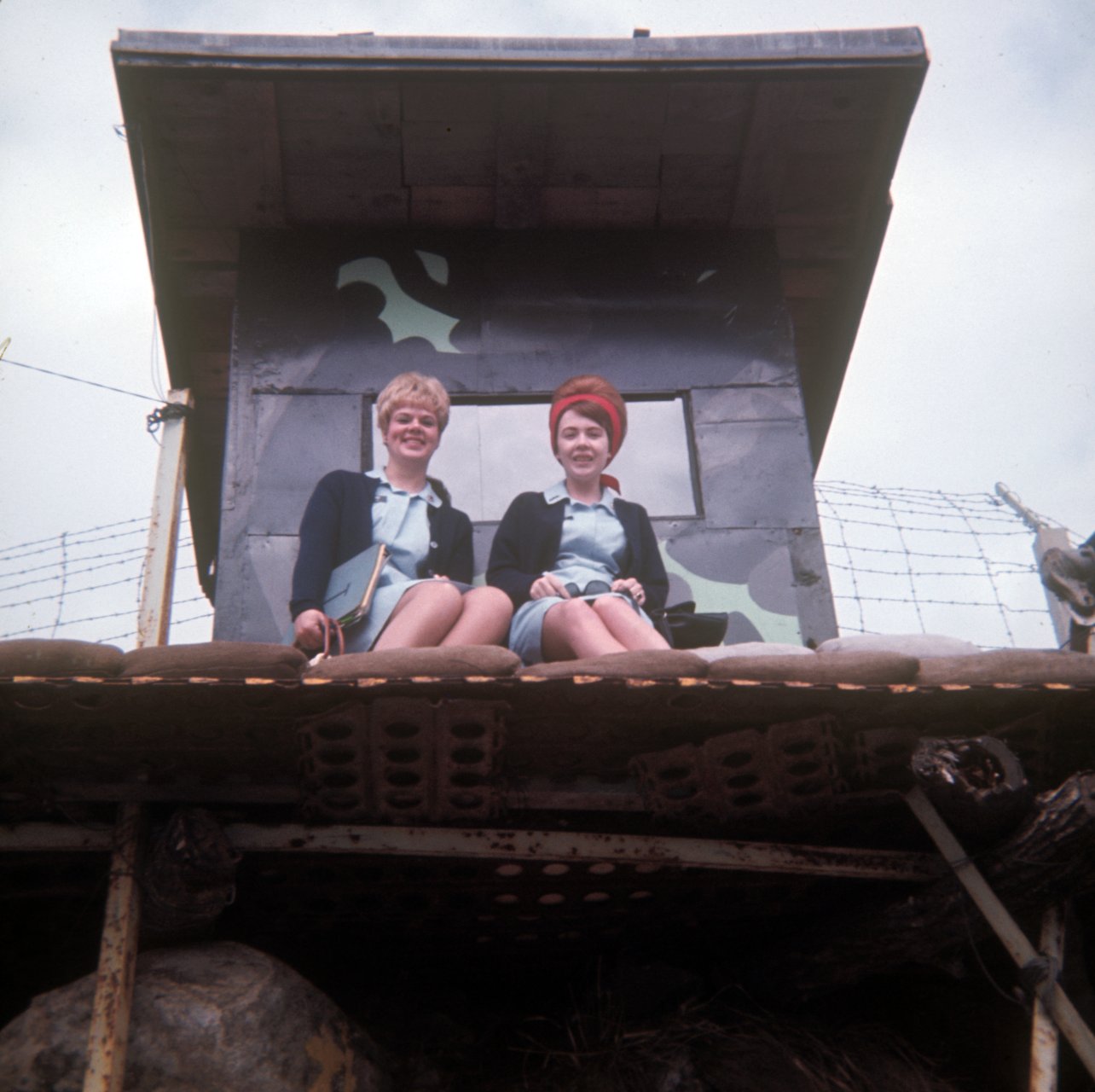 Linda Jones is seen here, on right, with another American Red Cross workers, sitting atop a guard tower at a U.S. Army tactical site, circa 1969.